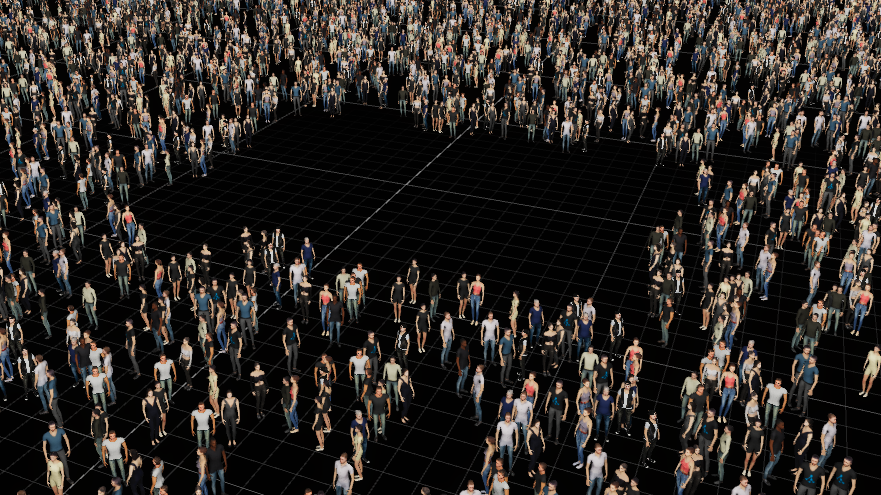 To render big crowds of people Depence has a so called MassCrowd Object, which procedurally places random instances of animated characters.