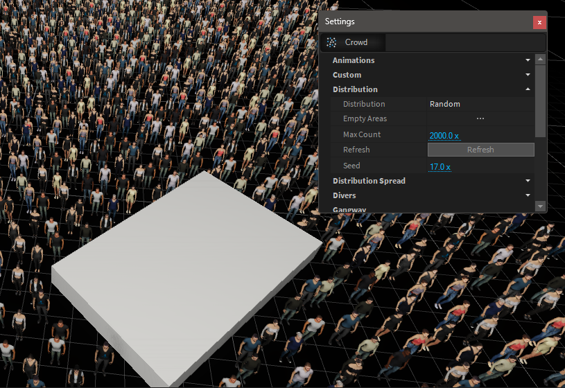 The Crowd instances are distributed depending on the current settings. The empty areas can be used to keep specific regions empty. This can be around stages or other scene elements.