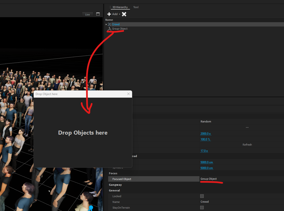 In the library window, navigate to Models > Peoples > Crowd then select and drag a Crowd-Object into the Scene.