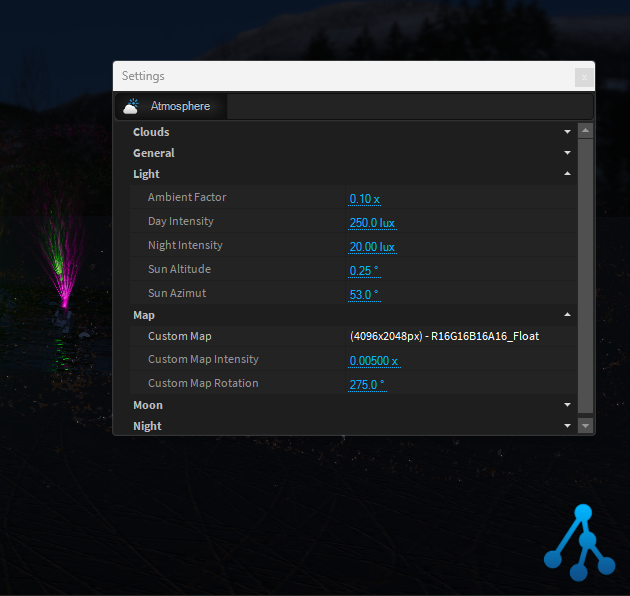 <figure><img src="https://content.gitbook.com/content/SJPsyh5CBOise9BtVNGO/blobs/nAbY6qhJnw0N06hIl2BB/image.png" alt=""><figcaption><p>HDR custom map applied to change the atmosphere background</p></figcaption></figure>