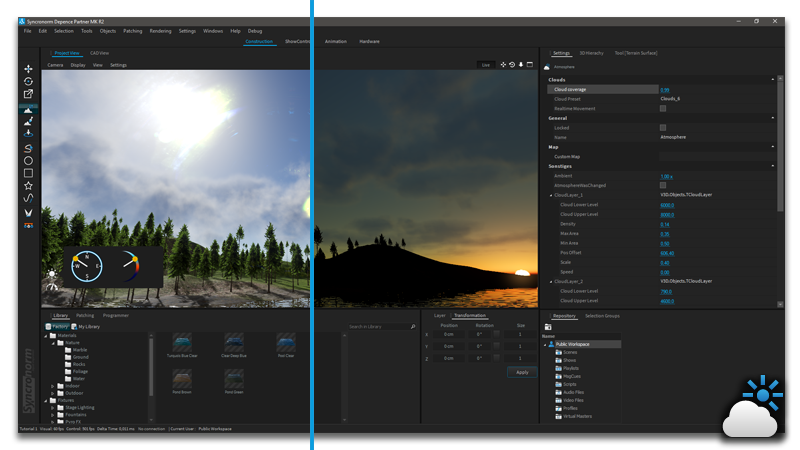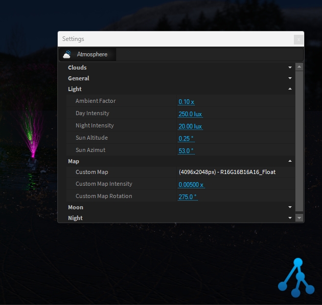 The Atmosphere object will automatically be added to your scene along with the terrain object after clicking on Objects > "Create Environment". The atmosphere simulates the sunlight & shadows along with atmospheric scattering depending on the sun's position.