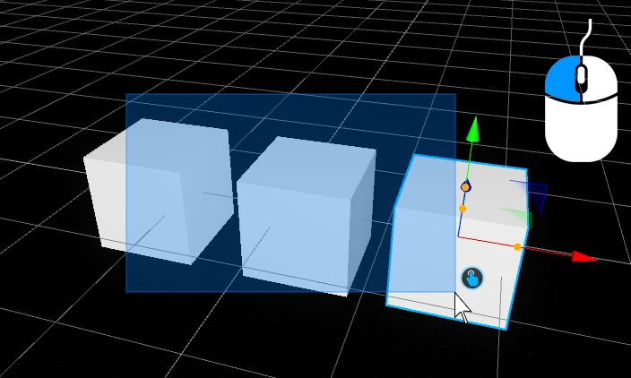 Each object can be selected with a single click, by using the left mouse button. By holding the left mouse button you can draw a selection rectangle to select all objects within that area. Hold CTRL or SHIFT key to add further selections.