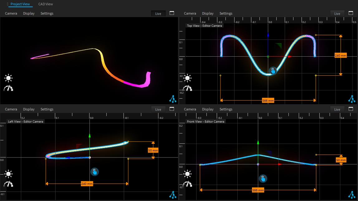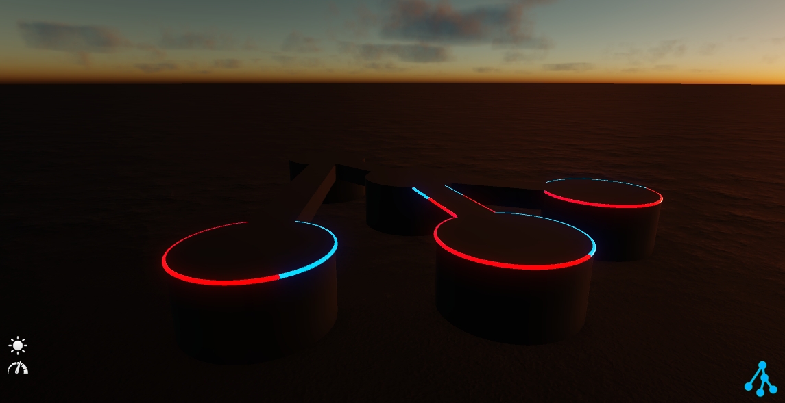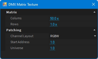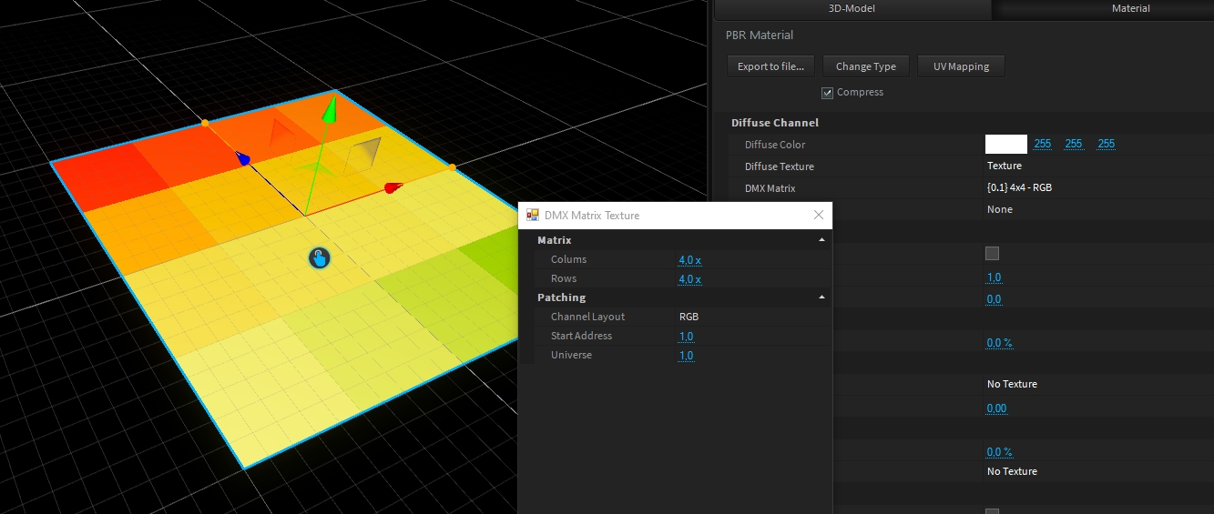 The DMX-Matrix feature creates a UV-mappable Matrix texture based on DMX values. This feature can be used to simulate thousands of LED fixtures without the performance overhead of individual fixtures because it directly reads DMX values from the internal buffer.