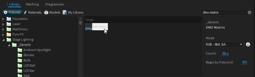 Now your material is ready to be used. You can patch the DMX Matrix fixture from the fixture library: