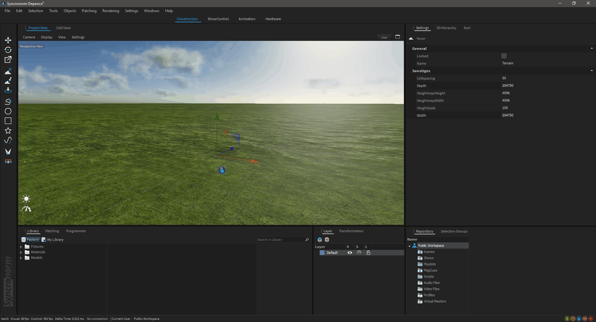The Depence rendering engine offers real-time tessellated terrain sculpturing and atmosphere scattering to render realistic outdoor scenes. To create terrain and an atmosphere click on Main Menu > Objects > Create Environment.