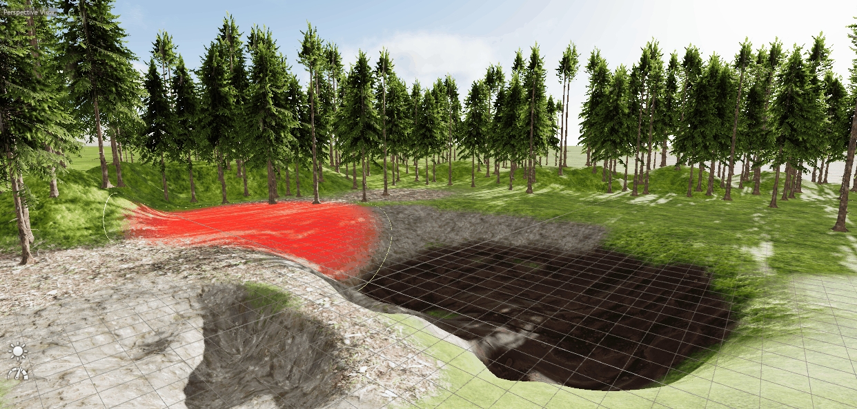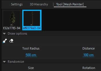 The Terrain Mass Placement Tool allows you to "draw" 3D Models onto the terrain surface. This can be used to easily spread vegetation on the terrain. Activate the tool on the left toolbar.