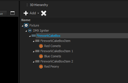 Add one or multiple CakeboxItem Objects to the Cakebox as children. Each CakeboxItem Object can carry one or more [shells](https://help.depence.com/depence-construction/firework/build-custom-effects/shell) as child.&#x20;
