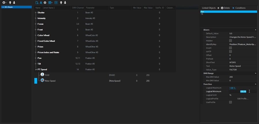 Adjust feature logic to match your fixture: (in this example, Pan Tilt Speed is from 100% speed @0 to 1% of its speed @255)