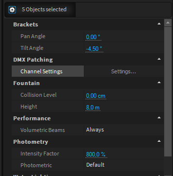 In the left list, all DMX parameters of the selected units are displayed in groups. For example, select Intensity here to make settings on the dimmer channel of all selected fixtures.