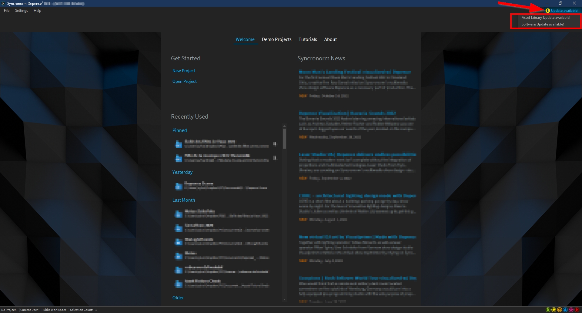 If an update is available, a notification will be displayed on the top right of the Depence homepage: