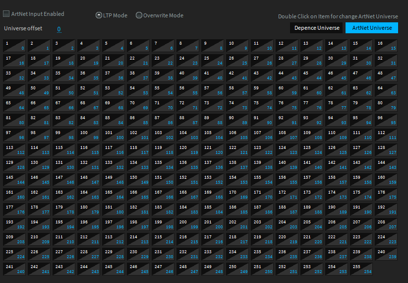 Once Depence receives ArtNET, the corresponding Universe will light up within the grid. It is also possible to change the Universe-Mapping by double-clicking on the cells.