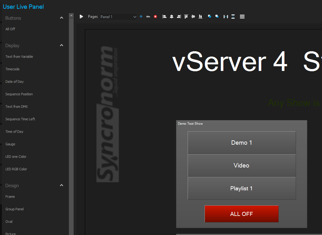 With the help of a User Live Panel, a user can start and stop shows and scenes. A wide range of information can also be displayed. You can connect the Logic Module to your Live Panel via variables and thus also display information from the Logic Module.