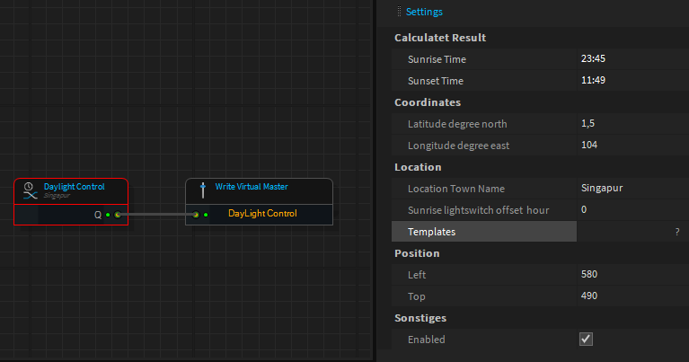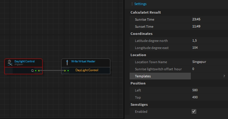 With the DayLight Control, the lighting of a fountain system can be switched off automatically during the day. For this purpose, the system calculates the current time for sunrise and sunset with the help of the location coordinates and controls a VirtualMaster connected to the output with this information.