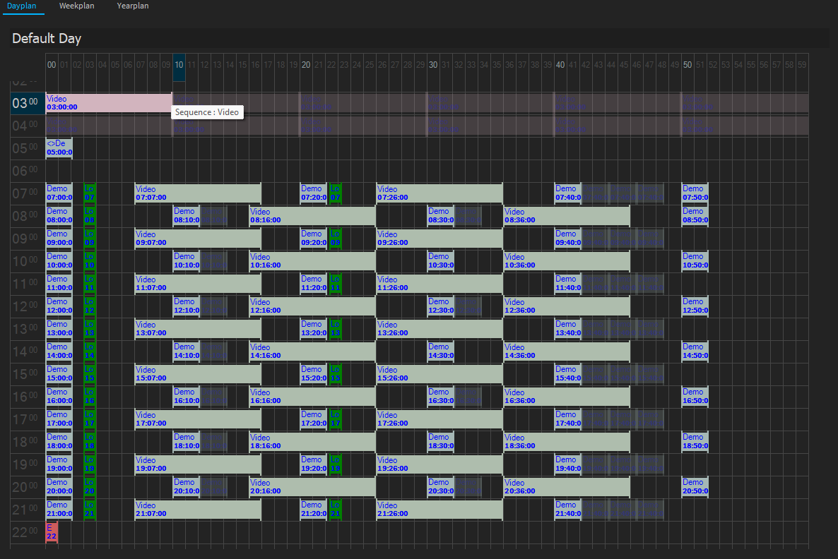 The daily planner is divided into 60 minutes on the horizontal axis and 24 hours on the vertical axis. Shows, scripts, scenes, and playlists can be dragged and dropped from the repository onto the daily schedule. The division is done in 1 minute steps. If a time between two full minutes has to be counted, this must be entered manually in the Settings window.