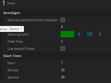 In a scene event, a scene is started in tracking mode. This means that values are only set. If values have to be deleted, this can only be done by starting a scene in which all DMX channels are reset to their home values. The fade time and delay time properties can be used to adjust the start behavior individually for each scene event.