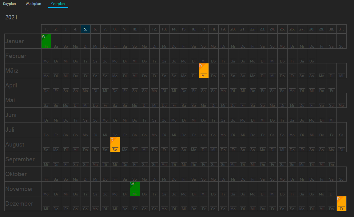 Create a new year schedule by adding a new year schedule in the listing of the Year Schedule area after right-clicking. Enter the current year as the name. For example 2021 Now double-click on the corresponding year plan to load it into the year plan editor.
