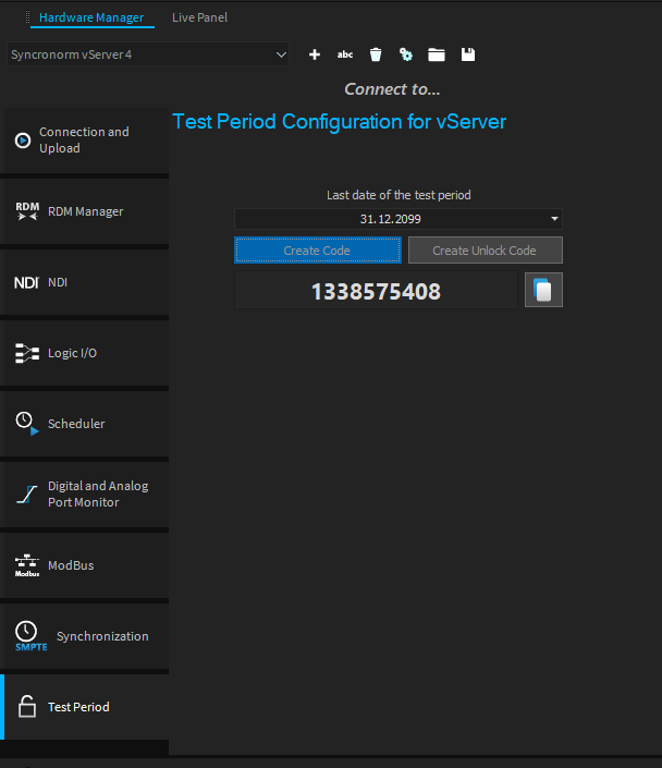 In Depence, you will find a new tab in the Hardware Manager called 'Test Period.' On this tab, there is a date field where you can enter the end date (i.e., the first day on which the vServer will go into emergency mode). Then press the 'Create Code' button to generate the test code.