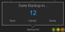 Before the system creates a backup, a countdown dialogue appears in which you can cancel the process with "Cancel" or carry out the backup process again with "Save". You can change the settings with "Setup".