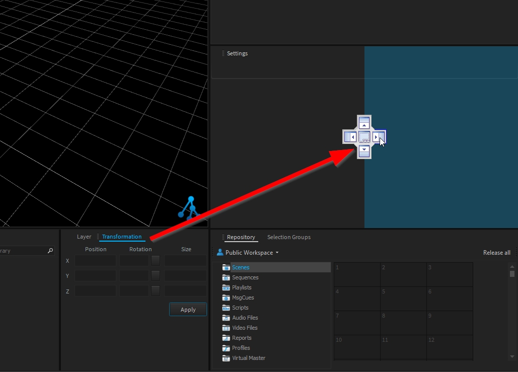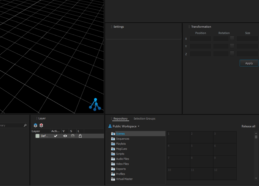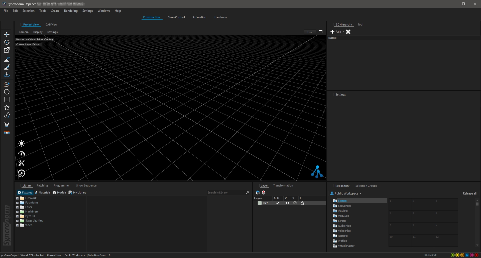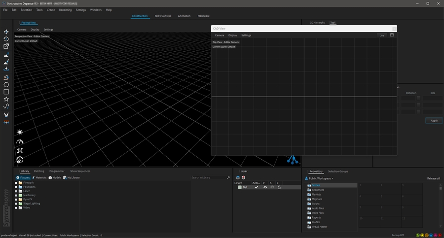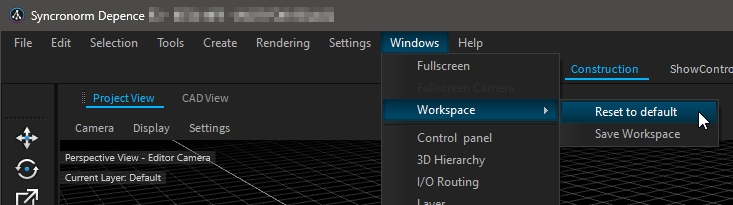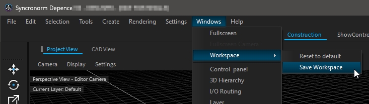 Default workspaces are Construction, Show Control, Animation and Hardware. Each workspace will show up and align in the required windows in the most effective way.