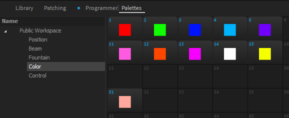 Using palettes for creating your scenes makes it is easy to change values without updating the scenes later on. When using a palette, instead of storing the DMX values in the scene, the programmer will store a reference to the selected palettes. The Palettes are also organized per Choreographer as same as the Repository.