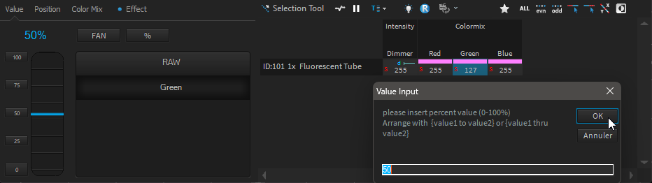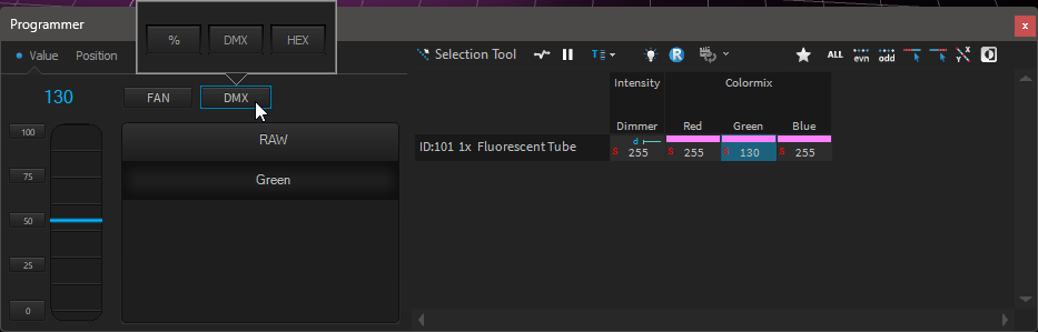 The value unit %, DMX or HEX follow the one you have set on top of programmer belt: