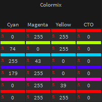 Example: In this example, the parameter type "Colormix" can be found along with the grouped channels Cyan, Magenta, Yellow, and CTO. Once you click on the parameter name, the Value Editor will select the correct editor to adjust, in this case, all colors at once. If you click on the Channel name, all cells for this channel will be selected and the Value-Editor will update.