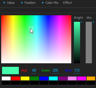 With the Color Mix editor, you can easily adjust colors on Colormix parameter channels. The Color-Mixer automatically detects the color mixing system whether it's additive or subtractive. It also mixes additive channels, which do not include primary colors like Amber, White, Lime, etc.