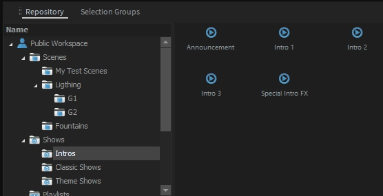 The repository is the storage of all show-related content like scenes, shows, music, videos, and more.