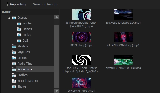 The audio and video files folder can hold all audio and video files used in your shows. To add new files to your repository right-click > "New", or simply drag a file from the windows explorer into the right side of the repository. All files added to the repository will be automatically copied into the project folder's content folder.