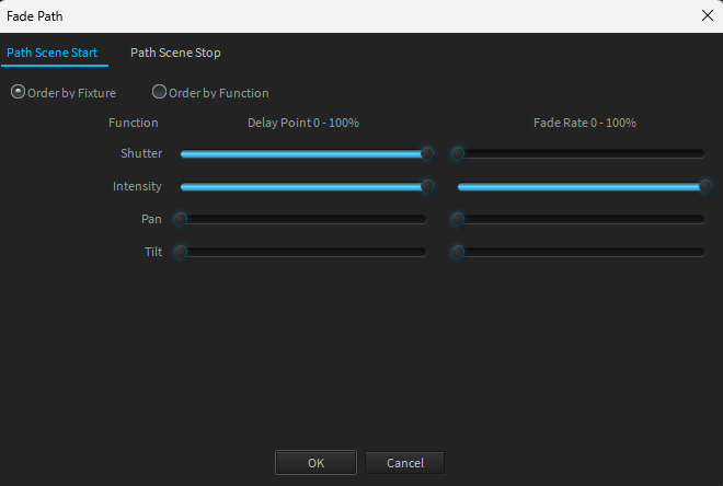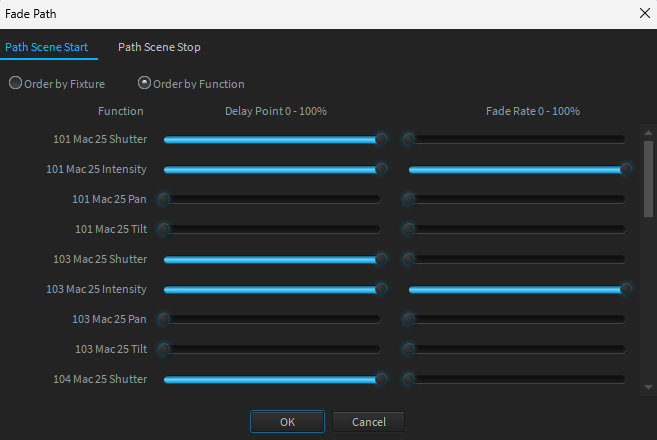 Order by Fixture combines all the same function types of a scene. Changes to the Delay and Fade faders change the fader rate or delay rate of all the same functions.