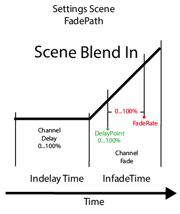 With Fade / Delay Path settings, more complex scene calls such as "Move in Black" can be realized. A FadePath describes how a single channel behaves when fading in and out of a scene. The delay time and the fade-in time can be set as a percentage of the scene fade time.