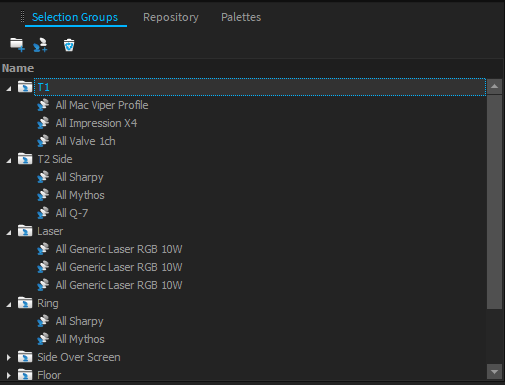 Ordered and organized fixture selection groups are essential for show programming. A Selection Group stores a list of fixtures and the order of how they were selected. Using these groups you always have quick access to all your fixture combinations.