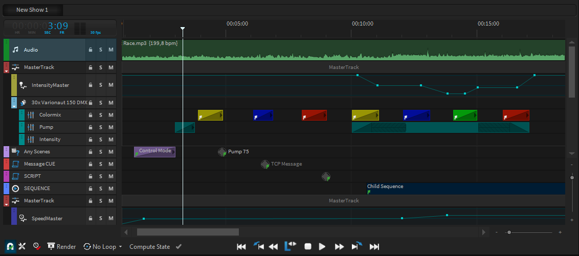 A Show File is a timeline composed of tracks that can be organized in a tree structure by using Folders, while all child objects will inherit their parent's Lock, Mute & Solo properties.