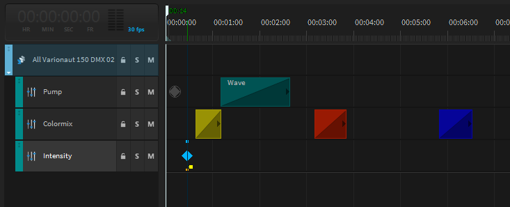 In the following example, a water wave was applied to a series of pumps. In the sequence, the dimmer channel of all lamps is now set to 100% in the track intensity. The Colormix channel then changes the colors during the sequence.