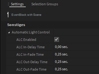 In order to use the ALC function, the property "ALC Enabled" is set to True in the settings of the scene in which the dimmer is set to 100%. The activated ALC function is marked with a yellow box within the scene.