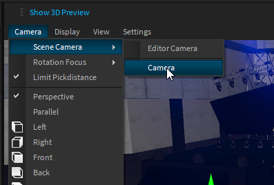 As mentioned earlier, the Viewport uses the Editor-Camera by default. You can change the active Camera on the Viewport-Menu > Camera > Active Camera.