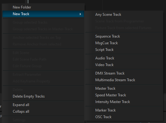 Folder-Tracks can be created with a right-click on the Track area and by choosing "New Folder". Depending on the workflow and usage case, the Sequencer supports different Track Types.