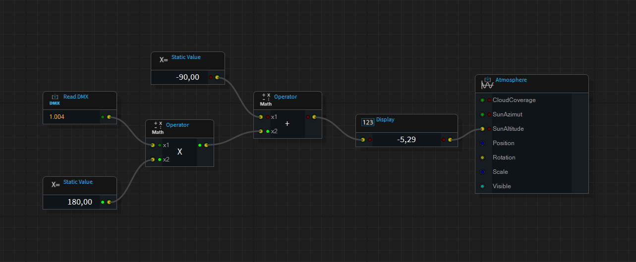 A quite often asked feature is, to get control over the sun position from the atmosphere-object by DMX. To do this you can use the powerful and flexible Logic feature of Depence.