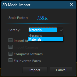 When importing models, Depence offers the option to import the scene in its original hierarchy or merged by materials. Both have pros and cons, but generally, if you are importing individual objects like a chair or a car, "Merged by Material" is best. If you are importing a complete scene from Blender, "by Hierarchy" might be better.