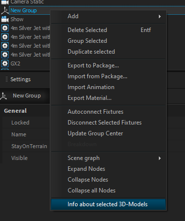 To find out how many models and polygons are used in a group or selection, right-click in the 3D hierarchy and select "Info about selected 3D-Models." This function also searches all child objects.