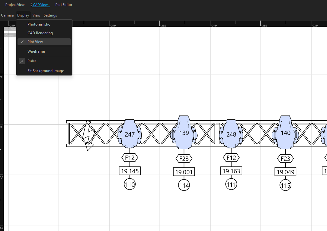 To control the visibility of fixtures and objects for each Plot View, you can assign a layer filter to each Plot View. In addition to other settings, a symbol-label definition can also be referenced.